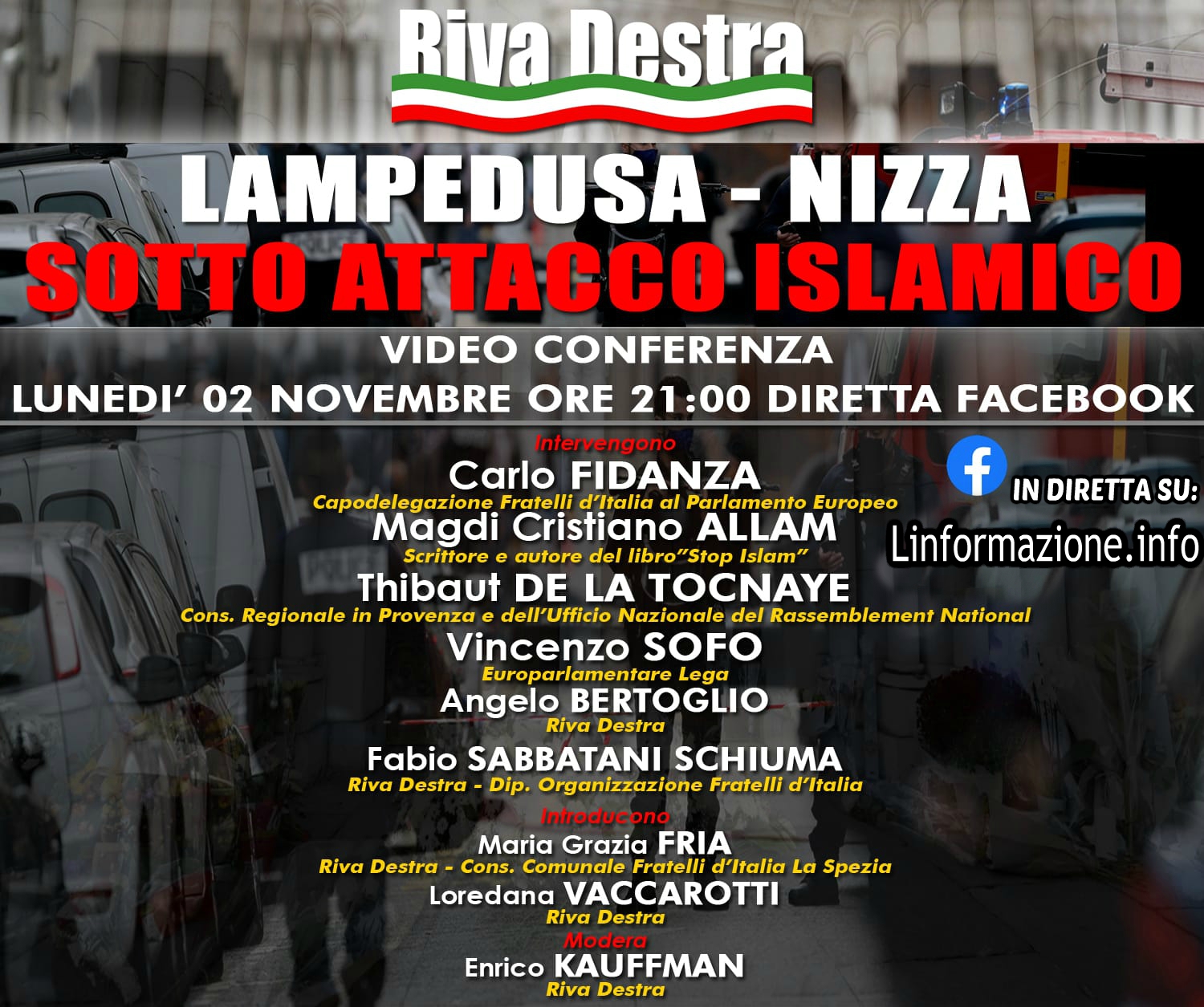 ROMA, 2 nov – “Si terrà stasera, lunedi 2 novembre, alle ore 21, una videoconferenza organizzata da Riva Destra sul problema del terrorismo di matrice islamica dopo l’attentato di Nizza. Interverranno Carlo Fidanza, Capodelegazione di Fratelli d’Italia al Parlamento europeo, Vincenzo Sofo, europarlamentare della Lega, Magdi Cristiano Allam, giornalista e autore del libro ‘Stop Islam’, Thibaut de La Tocnaye, consigliere regionale della Provenza e membro dell’Ufficio Nazionale del Rassemblement National (già Front National), oltre agli esponenti di Riva Destra Angelo Bertoglio e Fabio Schiuma, quest’ultimo componente del Dipartimento Nazionale Organizzazione di FdI. Introdurranno le promotrici dell’incontro Maria Grazia Fria, consigliere comunale di FdI a La Spezia e Loredana Vaccarotti di Riva Destra Viterbo. Moderera’ Enrico Kauffmann di Riva Destra”.È quanto annuncia una nota di Riva Destra, movimento nato nel 1994 dal primo storico circolo di Alleanza Nazionale.”Su quanto avvenuto a Nizza -si legge in una nota di Riva Destra- esprimiamo solidarietà al popolo francese e chiediamo il blocco navale subito. Inoltre raccogliamo il grido d’allarme delle forze di polizia che gia’ da tempo hanno segnalato al Ministro Lamorgese la pericolosità di utilizzare il foglio di via, previo processo di accertamento e di tracciabilita’ dell’immigrato nei suoi spostamenti come strumento di gestione dell’immigrazione clandestina. Riva Destra -continuano i promotori- sul tema dell’emergenza terrorismo ha sempre tenuto alta l’attenzione promuovendo sui territori un ciclo di incontri sull’emergenza terrorismo attraverso Cristiano Magdi Allam e sul tema non abbiamo mai abbassato la guardia. Oggi -conclude la nota- di fronte a quanto è successo e visto che si sta parlando di un lockdown europeo per sconfiggere il Coronavirus noi ne chiediamo uno altrettanto sull’immigrazione clandestina e contro il terrorismo, ribadendo che la questione della difesa dei confini europei che oggi è a carico dell’Italia di fatto divenga realmente un tema emergenziale che riguarda tutta Europa”.