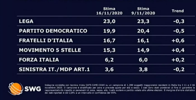 Secondo il sondaggio mostrato ieri da Tg La7 di SWG, il terzo partito d’Italia potrebbe salire presto un altro gradino del podio,