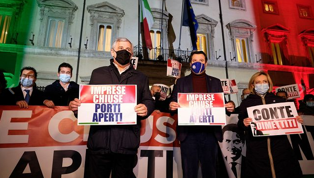 Meloni, Salvini e Tajani sono in queste ore davanti a Palazzo Chigi per protestare, insieme ai cittadini, contro le restrizioni imposte dal