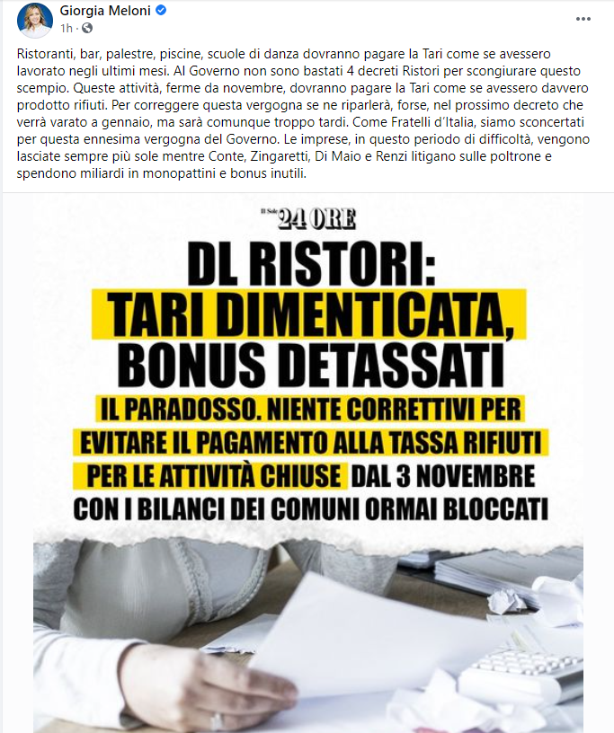 Ristoranti, bar, palestre, piscine, scuole di danza dovranno pagare la Tari come se avessero lavorato negli ultimi mesi. Al Governo non sono bastati 4 decreti Ristori per scongiurare questo scempio. Queste attività, ferme da novembre, dovranno pagare la Tari come se avessero davvero prodotto rifiuti. Per correggere questa vergogna se ne riparlerà, forse, nel prossimo decreto che verrà varato a gennaio, ma sarà comunque troppo tardi. Come Fratelli d’Italia, siamo sconcertati per questa ennesima vergogna del Governo. Le imprese, in questo periodo di difficoltà, vengono lasciate sempre più sole mentre Conte, Zingaretti, Di Maio e Renzi litigano sulle poltrone e spendono miliardi in monopattini e bonus inutili.