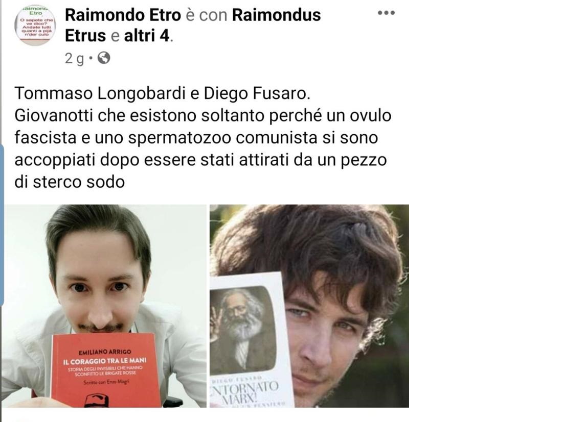 Tommaso Longobardi e Diego Fusaro. Giovanotti che esistono soltanto perché un ovulo fascista e uno spermatozoo comunista si sono accoppiati dopo essere stati attirati da un pezzo di sterco sodo”.