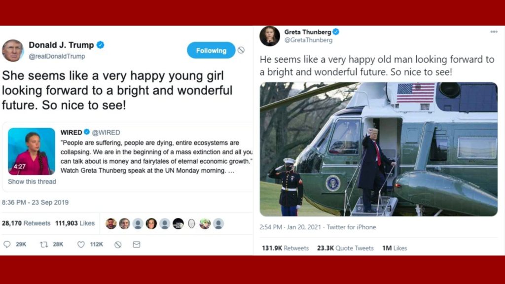 Non è la prima volta che la piccola attivista attende con pazienza Trump al varco. Lo scorso novembre Greta Thunberg aveva aspettato quasi un anno per servire il suo di piatto a Donald Trump, colpendolo nel momento giusto. “È così ridicolo. Donald dovrebbe lavorare sul suo problema di gestione della rabbia, e poi andare a vedere un bel film vecchio stile con un amico! Rilassati Donald, rilassati!”, ha scritto in un tweet la giovane attivista svedese in risposta al tweet del presidente degli Stati Uniti che furioso per la prospettiva di perdere le elezioni aveva scritto sul social, tutto in maiuscolo: “FERMATE IL CONTEGGIO”. Riprendendo, parola per parola, il tweet che le aveva dedicato Trump nel 2019.