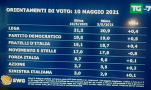Cresce un po’ di più il Pd, le 19,5%, ma che adesso teme l’ascesa di FdI e il possibile sorpasso.