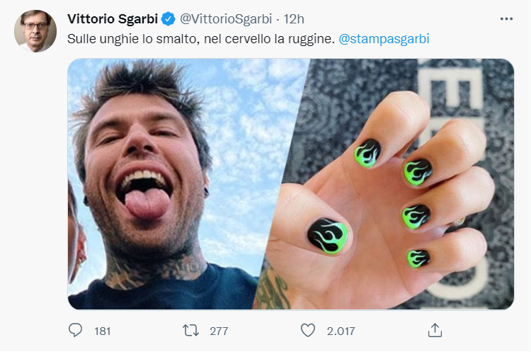Sgarbi affonda Fedez: “Sulle unghie lo smalto, nel cervello la ruggine”