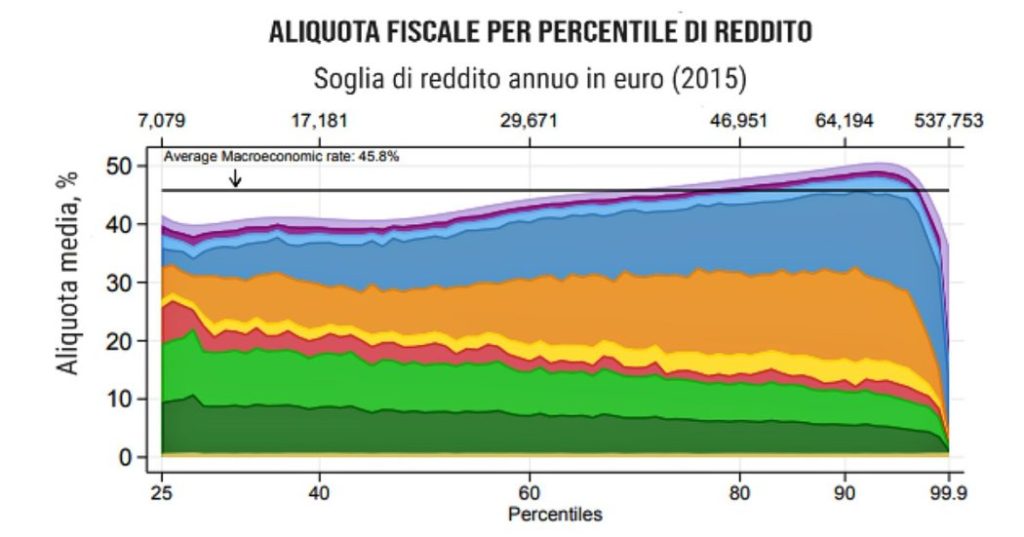 Il sistema fiscale italiano sembra essere progettato specificamente per aumentare la disuguaglianza: in pratica l’aliquota media pagata da quei contribuenti diminuisce all’aumentare del