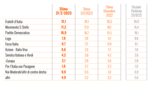Fratelli d’Italia infatti per il sondaggio sarebbe in crescita di un punto percentuale – circa 300.000 voti ragionando in termini elettorali – rispetto alla stessa indagine condotta a inizio mese.