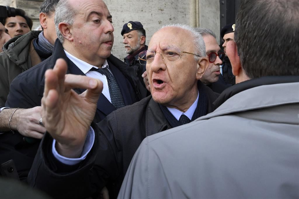 Il corteo di De Luca e dei sindaci al suo seguito é stato bloccato davanti al ministero per gli Affari Europei da un cordone di agenti di polizia, dove il clima ha cominciato ad agitarsi e sono partiti gli spintoni. Al ché De Luca e i sindaci hanno deciso di cambiare direzione ed avviarsi verso Palazzo Chigi. Ma anche l’ingresso su piazza Colonna era impossibile. Dai manifestanti, che hanno bloccato la circolazione su via del Corso, si è alzato il grido “fascisti, fascisti” ed è stata intonata “Bella ciao”. Solo De Luca è riuscito a fatica a superare il cordone di agenti di polizia e a dirigersi verso la sede del governo chiusa precedentemente per questioni di sicurezza. Nel frattempo Giorgia Meloni era in Calabria e alla notizia di ciò che stava avvenendo ha commentato con i giornalisti: “Se si lavorasse invece di fare le manifestazioni si potrebbe ottenere qualche risultato in più. Tutti i presidenti di Regione hanno capito il senso di quello che stiamo facendo. Tutti sono collaborativi tranne uno, ma nemmeno mi stupisce troppo”. De Luca, alla fine entrato in un palazzo delle istituzioni, Montecitorio, ha saputo delle parole del premier tramite i giornalisti presenti e non ha esitato nel rispondere, definendola “una str… Per lavorare ci servono i soldi. È tollerabile questo atteggiamento con centinaia di sindaci che non hanno i soldi per l’ordinaria amministrazione? Lavora tu, str...”, ha detto prima di uscire dalla Camera dei deputati e dirigersi verso la Prefettura dove è stato ricevuto dal prefetto di Roma, Lamberto Giannini. Le ignobili offese del governatore campano hanno indignato immediatamente Meloni e Fratelli d’Italia, che ha commentato: “Le parole offensive usate da De Luca contro il Presidente Meloni sono inaccettabili, così come indegno è il comportamento assunto dal governatore della Campania nei riguardi delle Forze dell’Ordine. Attendiamo una condanna unanime e una netta presa di distanza dal suo partito.