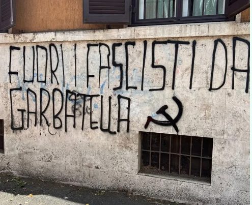 “Ferma condanna contro le minacce comuniste e anarchiche rivolte alla sede di Fratelli d’Italia e Gioventù nazionale di Garbatella. Sui muri della