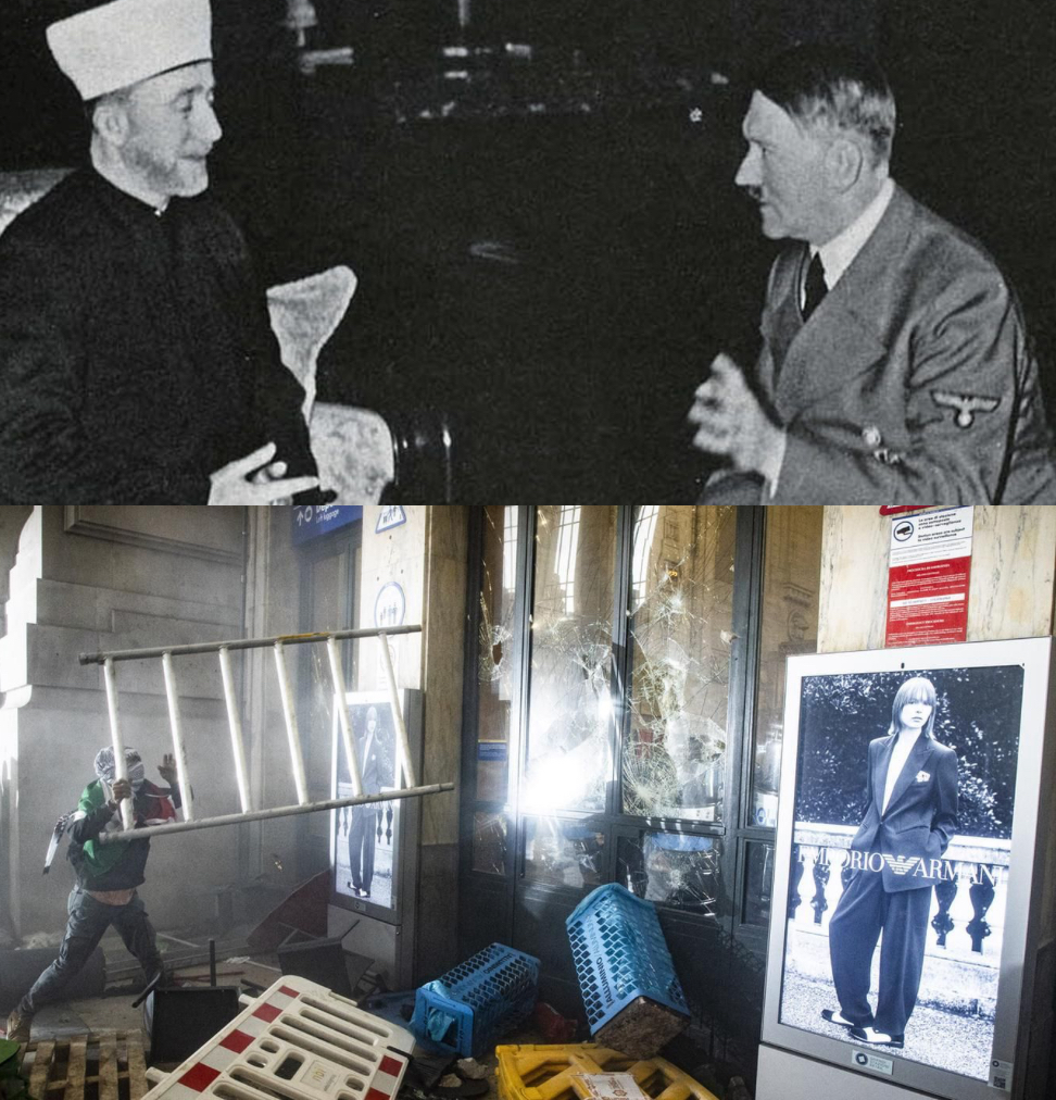 In alto il grande Muftì dell’Islam con Adolf Hitler, sotto gli scontri del 22 scorso indossando la kefiah Di Andrea Franchi Il